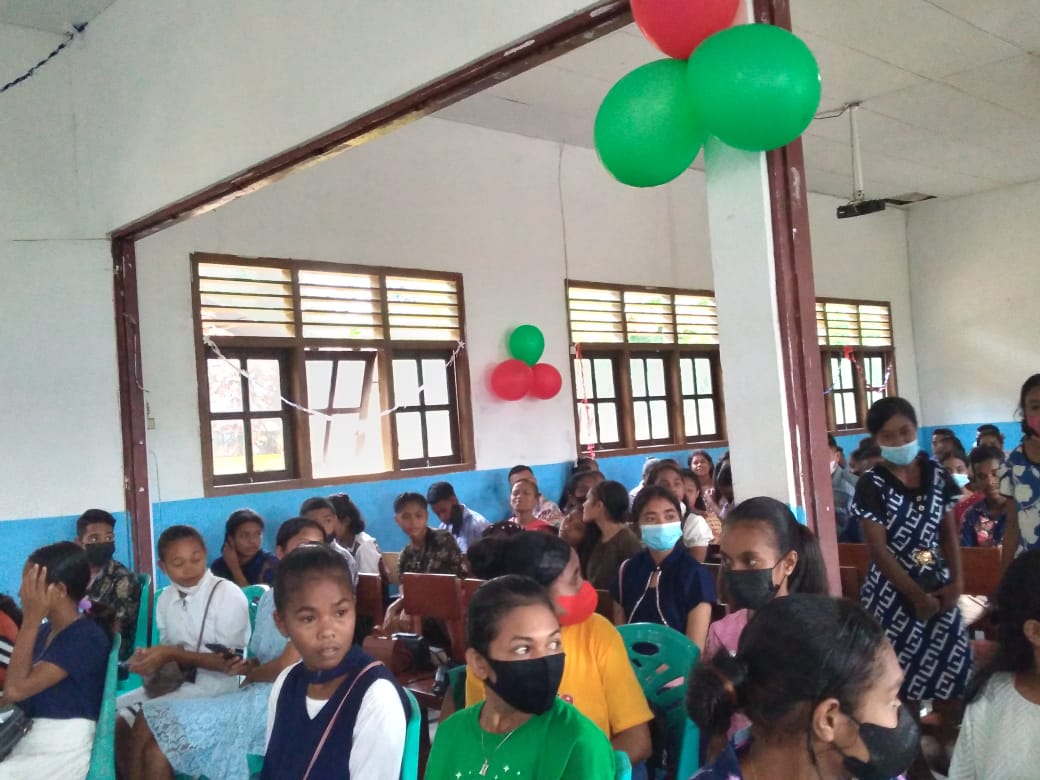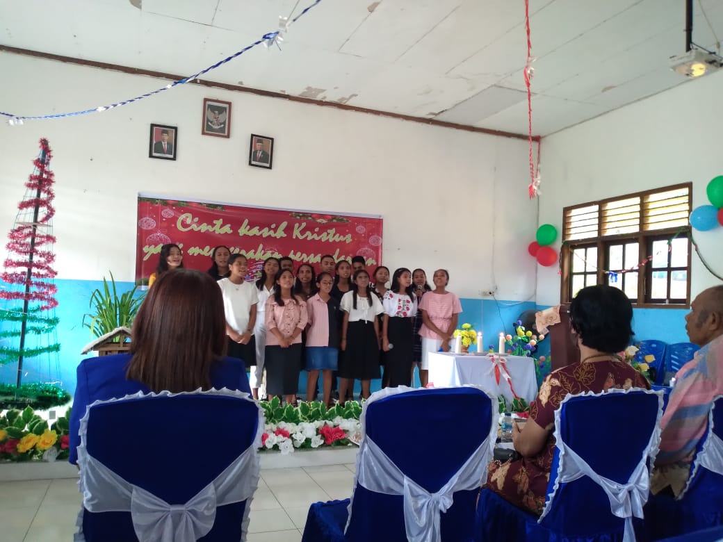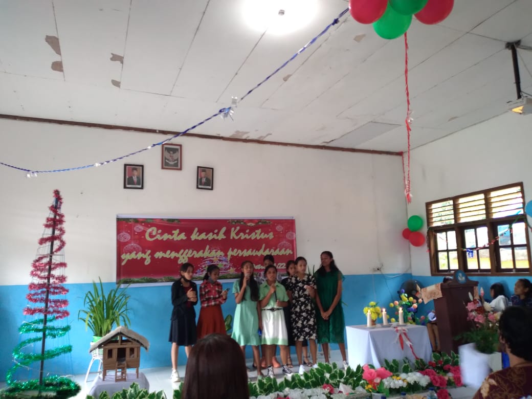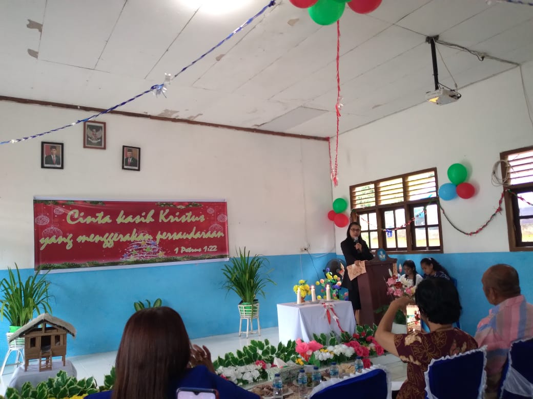 natal sekolah yang dihadiri oleh kepala sekolah, ibu pendeta, ibu pengawas dinas kemenag serta para guru